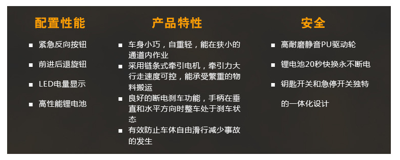 采用進口驅動輪,配置可靠的盤式剎車系統(tǒng),動力強勁,操控自如,配有大容量的高效能電池,電量持久,帶電量顯示表,低電壓報警燈,采用重型設計,結構緊湊,操作視野開闊。